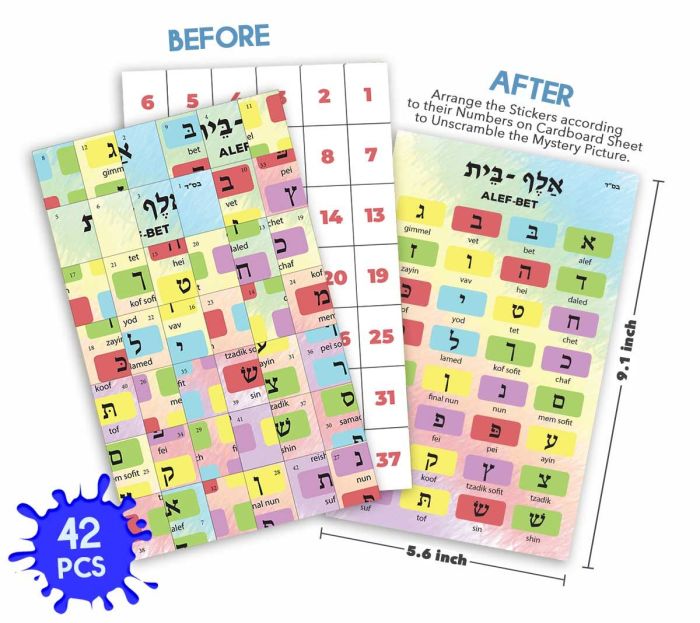 Discover and learn the Hebrew Aleph Beis with this engaging sticker puzzle. Arrange the 42 stickers on the cardboard sheet by matching the numbers to reveal a mystery picture. Each Hebrew letter features its name in English, making it an interactive and educational activity for kids and adults.