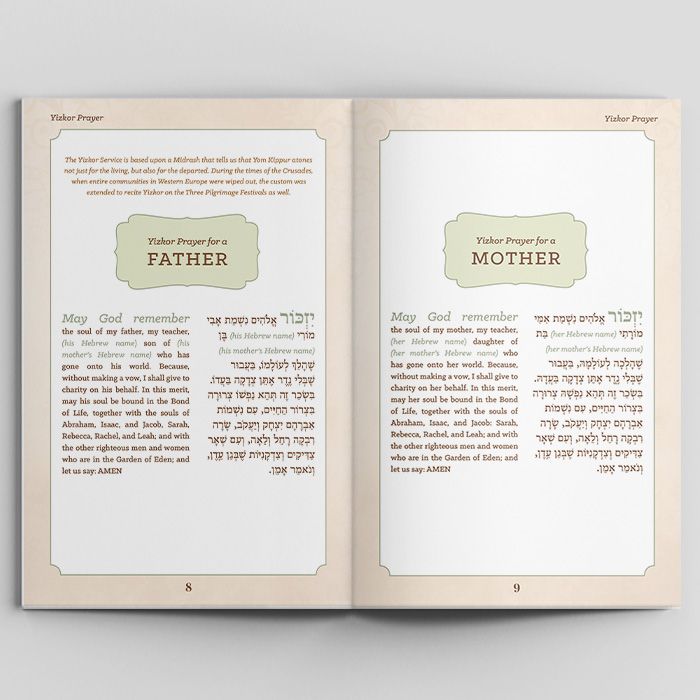 The Yizkor is included with a fresh clear type, a beautiful design, and explanations and instructions for the tefilos (and why it's so important to pledge tzedakah at this time)