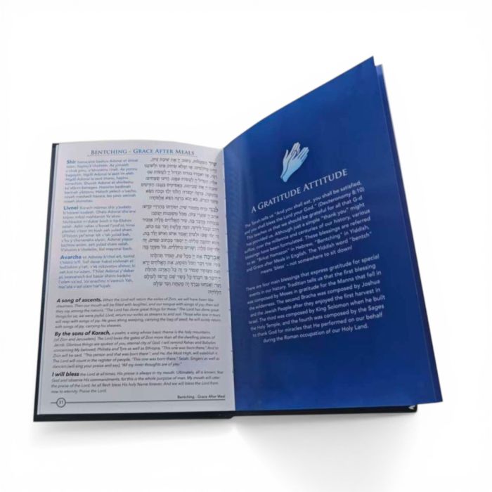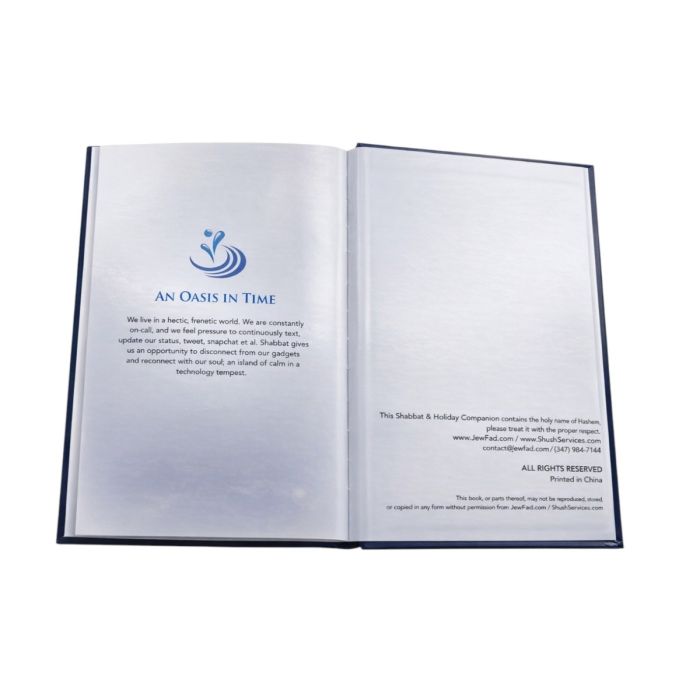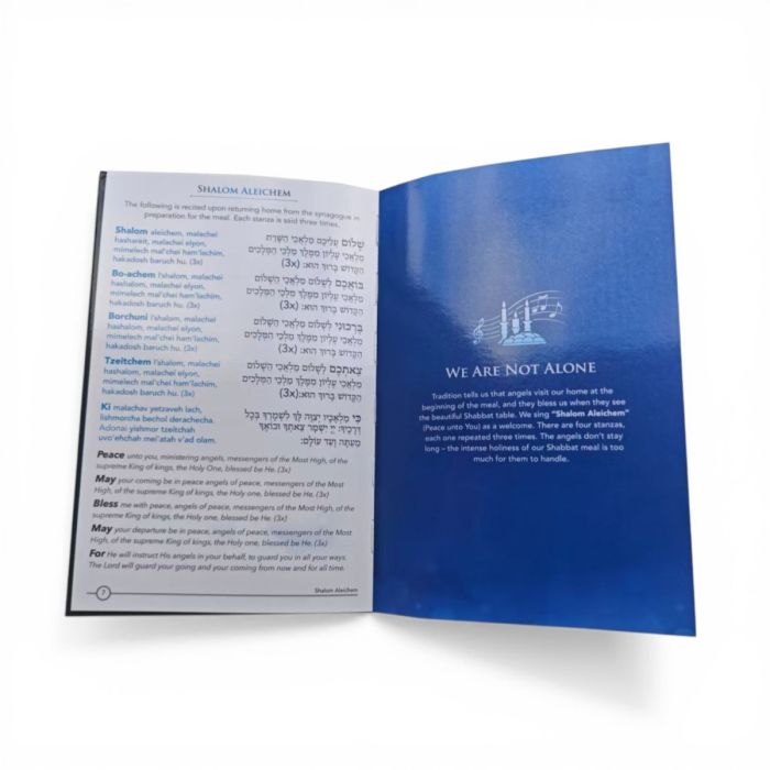 The elegant blue hardcover design opens right to left, making it perfect for use on your Shabbat table. The artwork complements the text, making it not only a useful guide but also a visual delight.