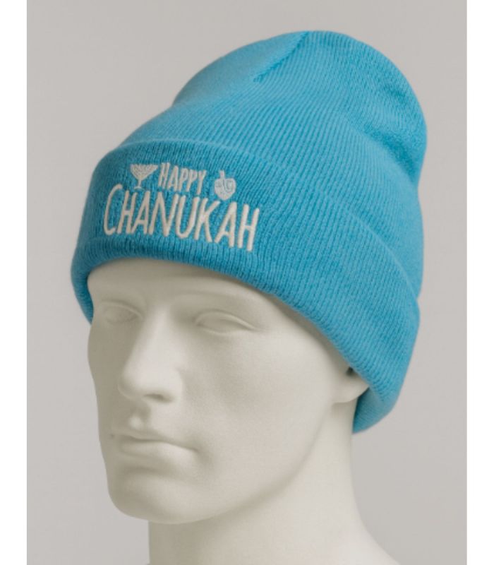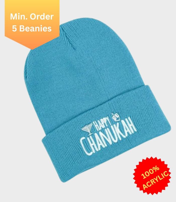 Neon Blue Happy Chanukah Beanie - Regular Embroidery [Min. 5 Beanies]