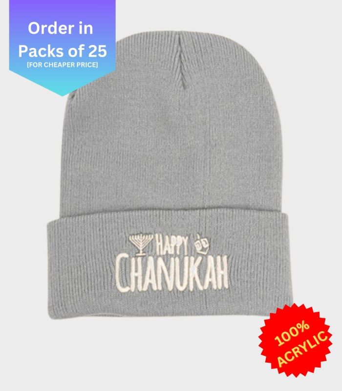 Neon Grey Happy Chanukah Beanie - Regular Embroidery [Order in Pack of 25]