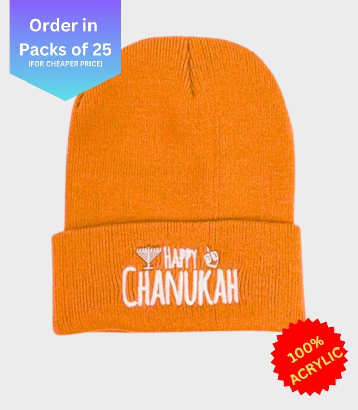 Neon Orange Happy Chanukah Beanie - Regular Embroidery [Order in Pack of 25]
