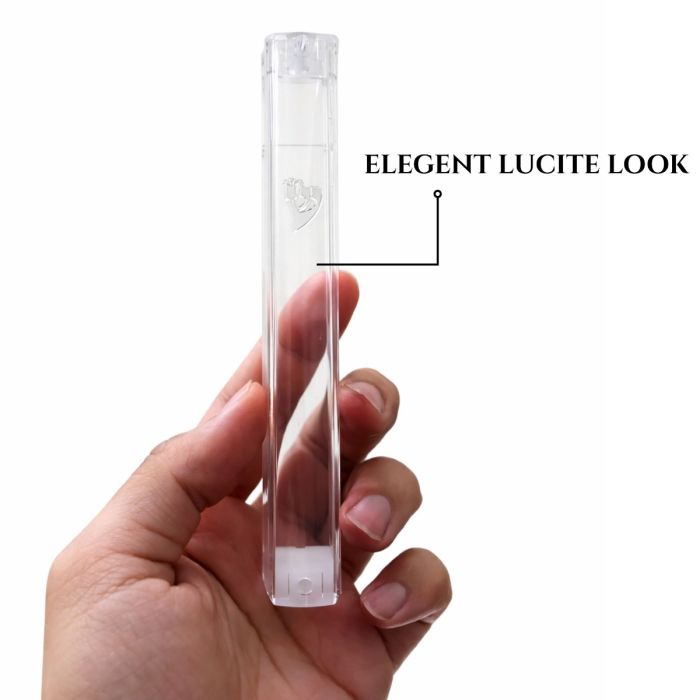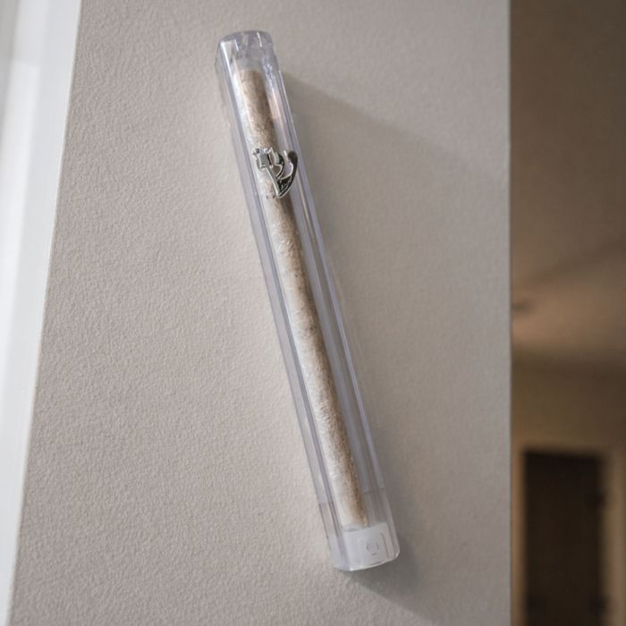 » Fits upto 5 inches (12cm) Mezuzah scrollThis Clear Plastic Mezuzah Case is a simple and elegant way to protect your mezuzah scroll.