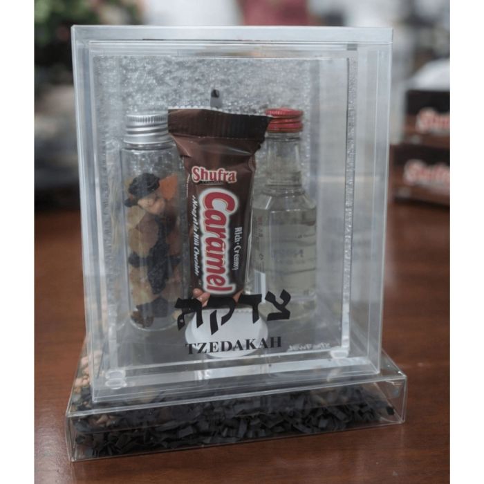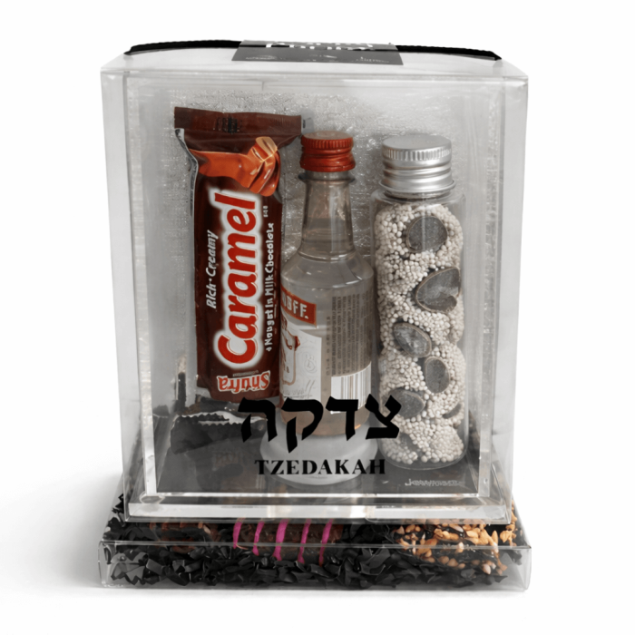 Size: The Tzedakah Box measures 5.5 x 4.4 x 7.2 inches, providing a perfect fit for the treats and vodka inside.