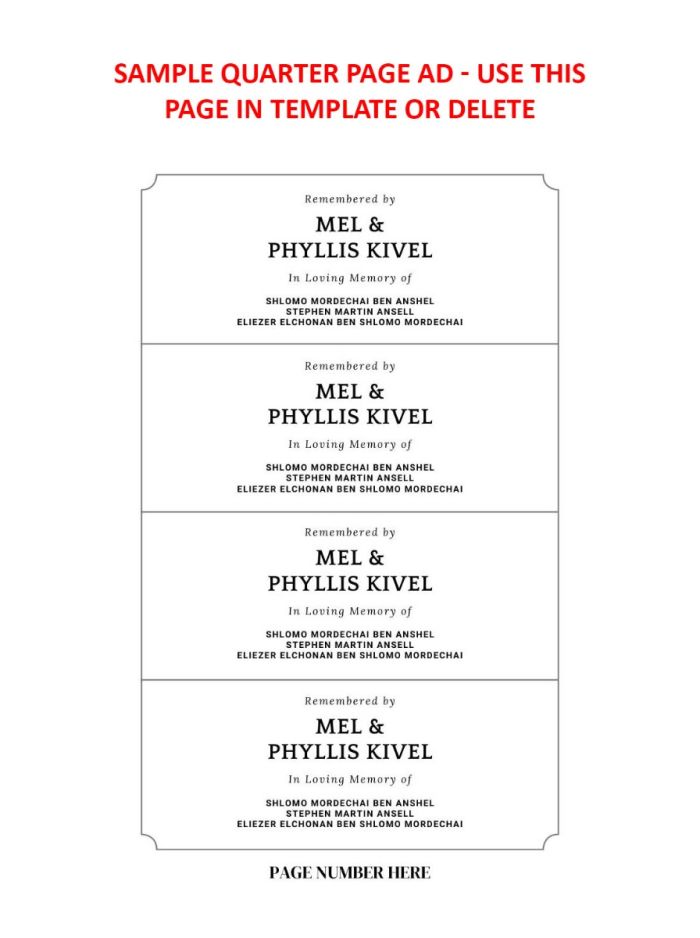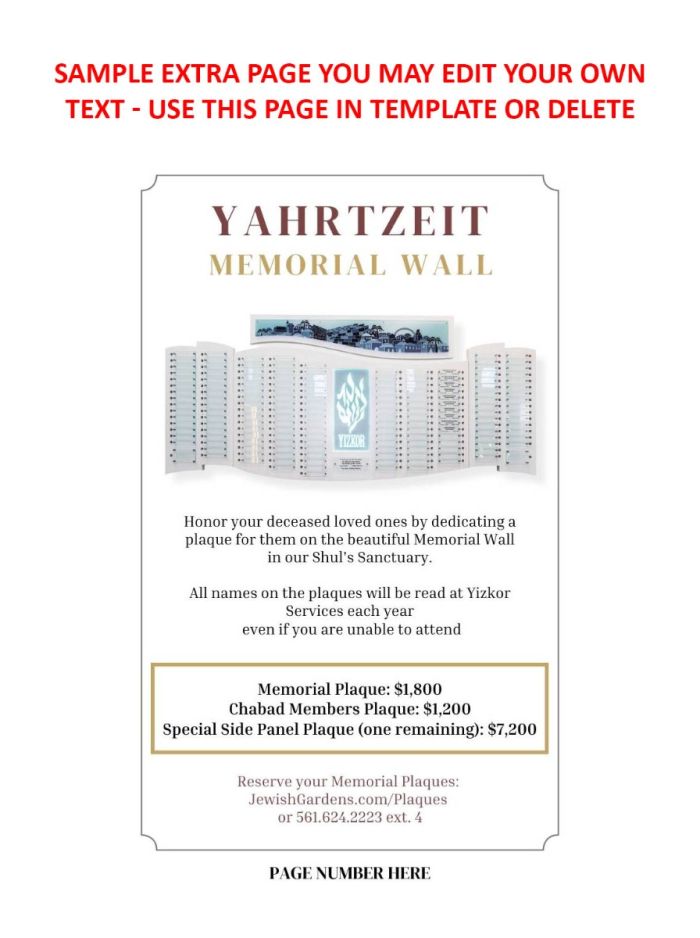 On the back cover, you can choose to include all Yizkor dates for the coming year — a great way to encourage people to return to shul. (Or leave this out if you’d like to reuse your booklet each year.)
