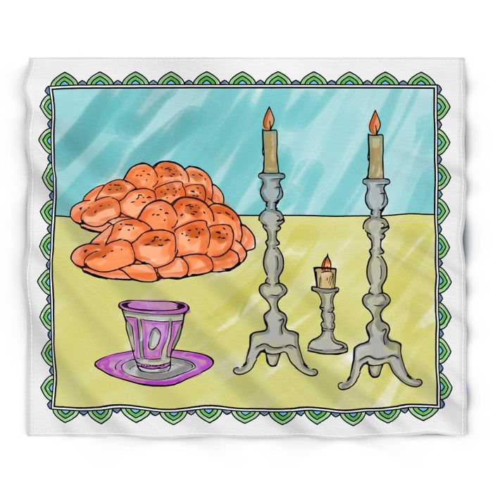 Design: Pre-printed Shabbat scene with challah, candles, and kiddush cup