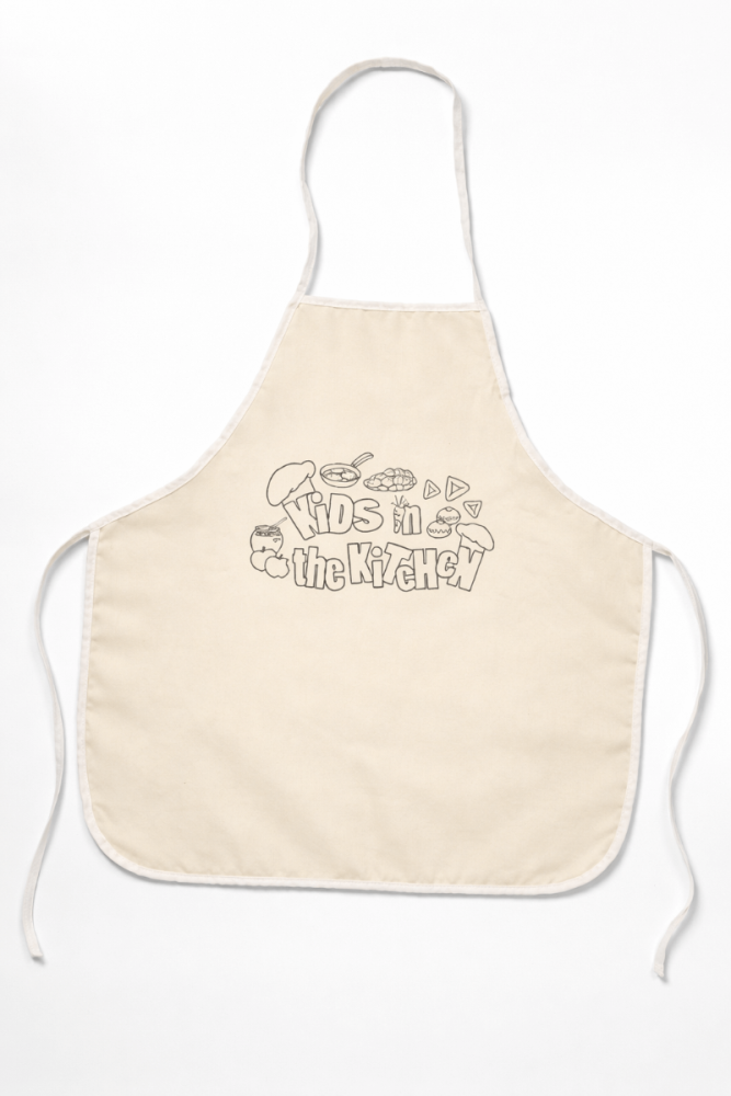 These aprons are washable polyester, and are pre-printed with a "Kids in the Kitchen" logo + artwork.