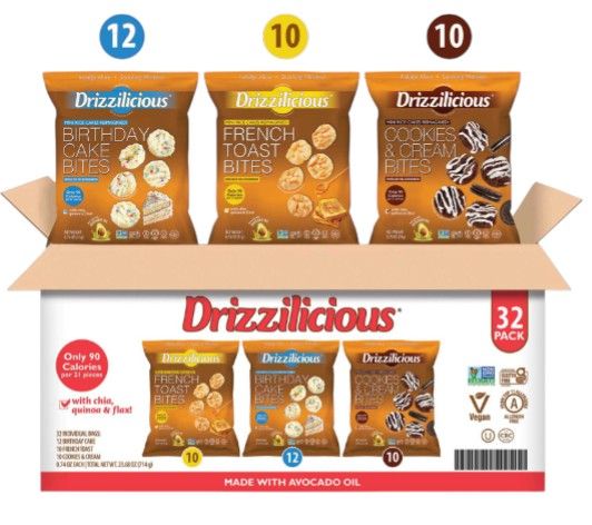 This Variety Box features three irresistible flavors: Birthday Cake, French Toast, and Cookies & Cream. Each mini rice cake bite is drizzled to perfection, delivering a satisfying crunch and burst of flavor in every bite.