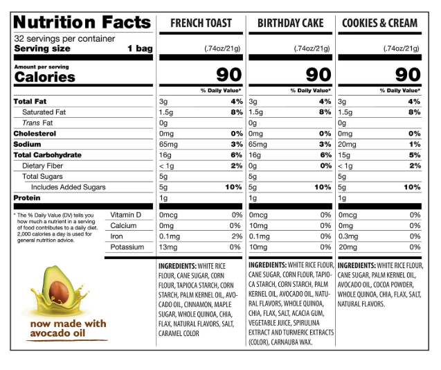 1: French Toast Ingredients: White Rice Flour, Cane Sugar, Corn Flour, Tapioca Starch, Corn Starch, Palm Kernel Oil, Avo-Cado Oil, Cinnamon, Maple Sugar, Whole Quinoa, Chia, Flax, Natural Flavors, Salt, Caramel Color