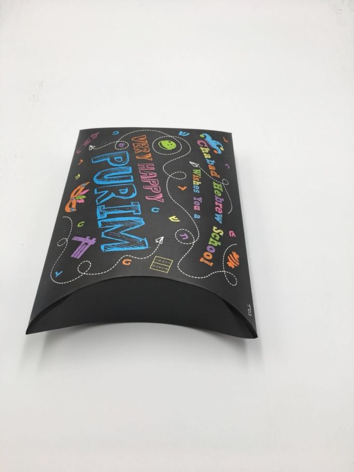 This chalkboard Hebrew School Purim Pillow box wishes you a Happy Purim from Chabad Hebrew School on the front (along with Purim illustrations including a Megillah, mask and Hamantashen), while explaining all about the 4 mitzvos of Purim on the back.