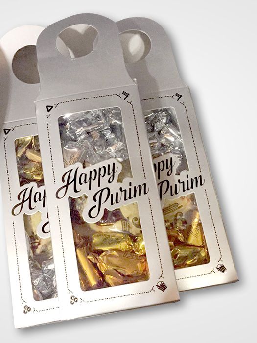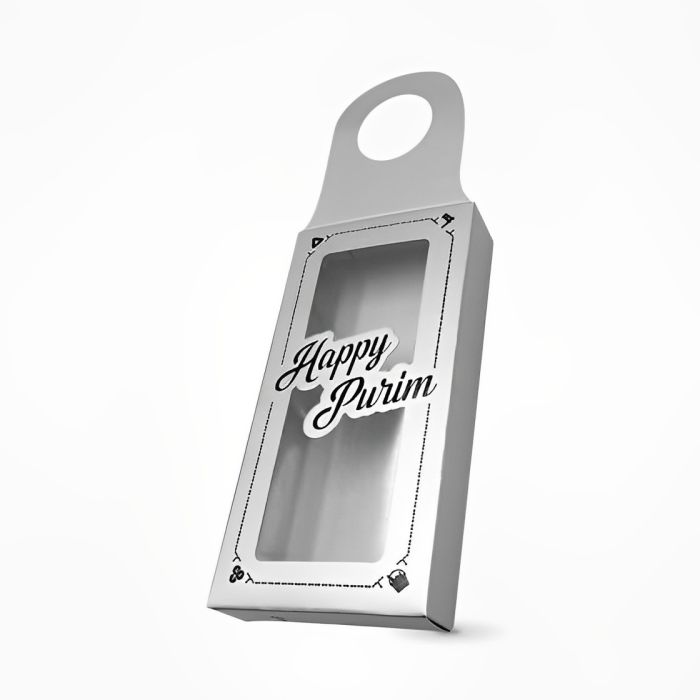 Top off almost any bottle with these bottle hanger boxes for a uniquely decorative shaloch manos. Features a loop to fit over most types of bottles (wine, beer, soda, or water bottles), this shaloch manos box can be filled with hamentaschen, tasty treats, and fun favors.