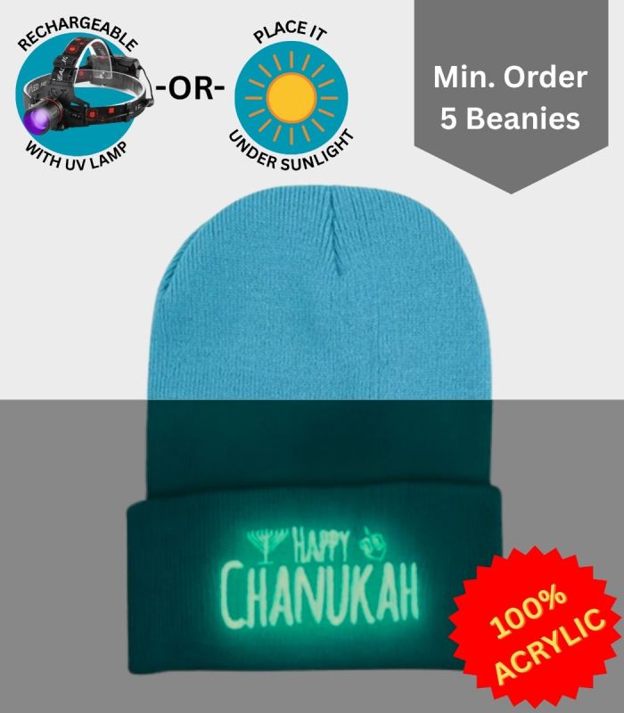 Neon Blue Happy Chanukah Beanie - Glow-in-Dark Embroidery [Min. 5 Beanies]