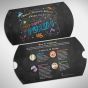 This chalkboard Hebrew School Purim Pillow box wishes you a Happy Purim from Chabad Hebrew School on the front (along with Purim illustrations including a Megillah, mask and Hamantashen), while explaining all about the 4 mitzvos of Purim on the back.