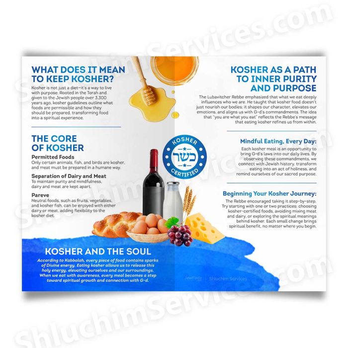 This beautifully designed kosher brochure explains the deeper meaning behind keeping kosher—how it nourishes both body and soul. Ideal for outreach, education, and community engagement, it transforms kosher from a list of rules into a meaningful, accessible lifestyle.