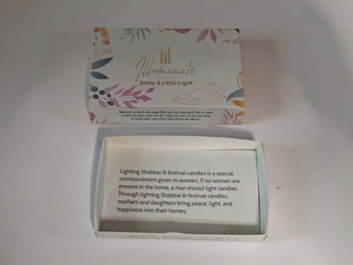 Designed in a stylish matchbox format, each box features the phrase “Illuminate – Shine Your Light” on the cover, along with the Shabbat candlelighting blessing printed in Hebrew, English, and transliteration. When opened, the inside flap offers a short and touching explanation about the special mitzvah of lighting Shabbat and festival candles.