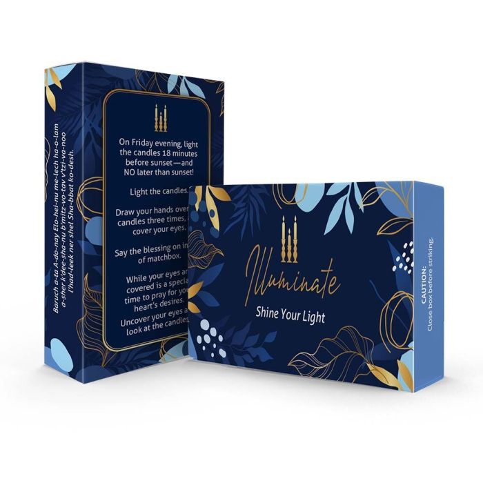 Designed in a stylish matchbox format, each box features the phrase “Illuminate – Shine Your Light” on the cover, along with the Shabbat candlelighting blessing printed in Hebrew, English, and transliteration. When opened, the inside flap offers a short and touching explanation about the special mitzvah of lighting Shabbat and festival candles.