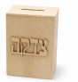 Each box features a classic cube-shaped design with a pre-cut coin slot on top and a removable bottom for easy access to collected funds. The front is subtly accented with a wooden Tzedakah/Charity design, adding a beautiful, traditional touch to your custom creation.