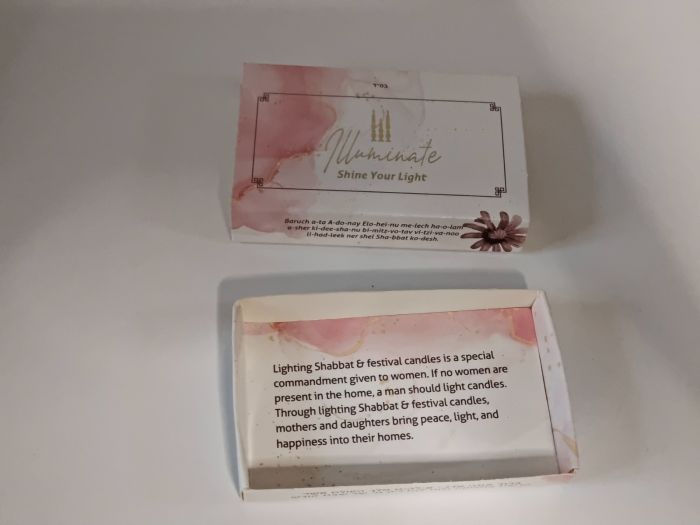 Designed in a stylish matchbox format, each box features the phrase “Illuminate – Shine Your Light” on the cover, along with the Shabbat candlelighting blessing printed in Hebrew, English, and transliteration. When opened, the inside flap offers a short and touching explanation about the special mitzvah of lighting Shabbat and festival candles.