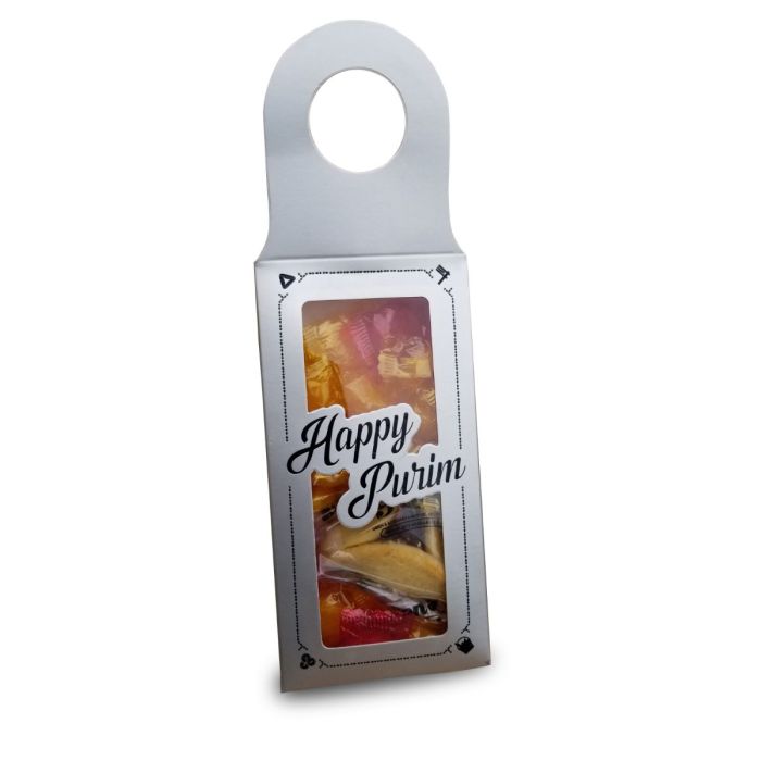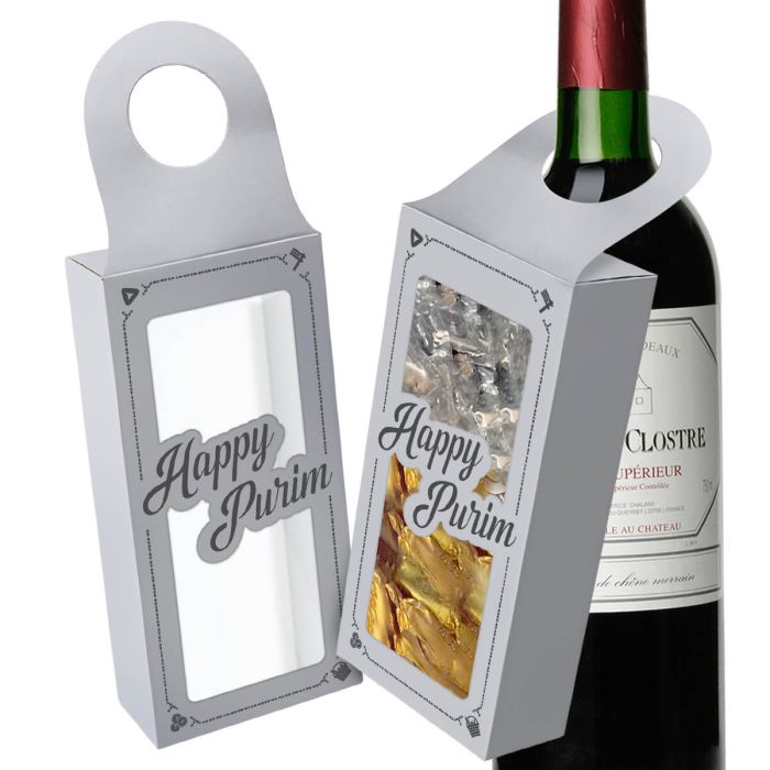 Top off almost any bottle with these bottle hanger boxes for a uniquely decorative shaloch manos. Features a loop to fit over most types of bottles (wine, beer, soda, or water bottles), this shaloch manos box can be filled with hamentaschen, tasty treats, and fun favors.