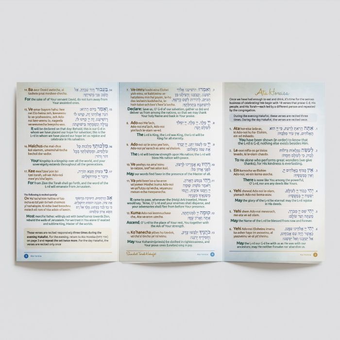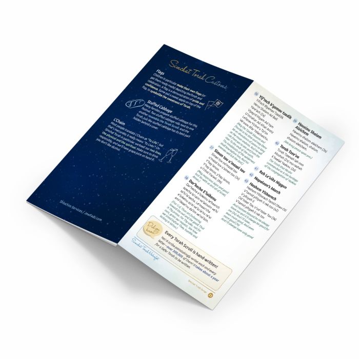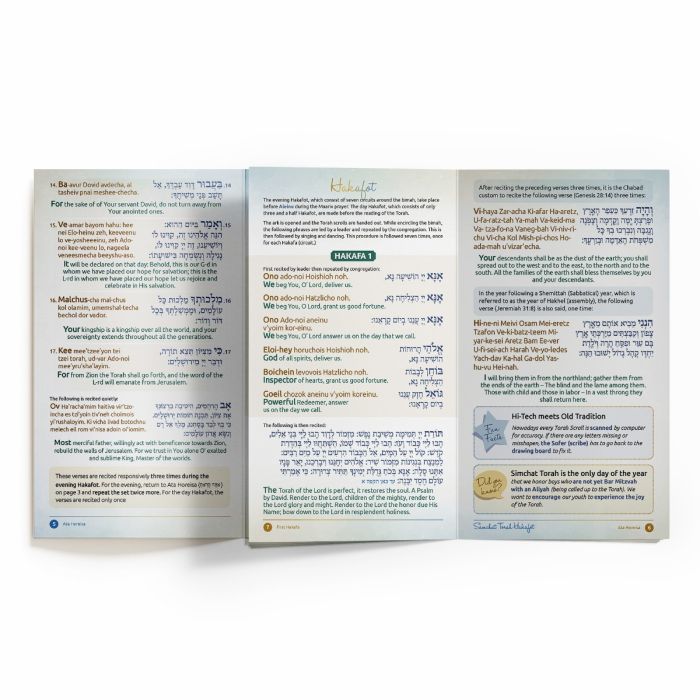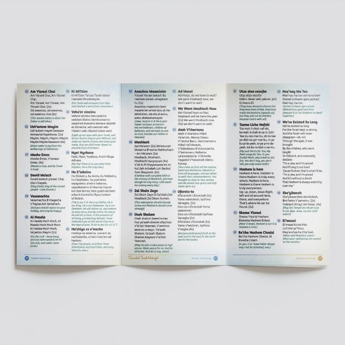 The back fold-out contains 45+ classic Simchat Torah songs, now updated to include Hashem Yitborach Tomid Ohev Oti. Sisu VâSimchu (Daytime prayer) is also included, making the booklet fully comprehensive.