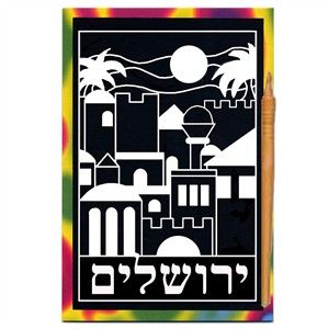 Yerushalayim( in Hebrew) scratch art boards and wooden stylus set. Scratch surface of the board and reveal rainbow colors.