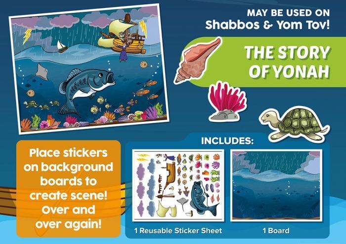Designed for use on Shabbos and Yom Tov, this interactive craft allows kids to build and rebuild Yonahâs journey, from the stormy seas to the giant fish, using colorful stickers that can be placed, removed, and rearranged over and over again.